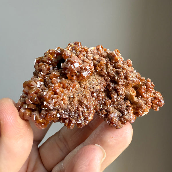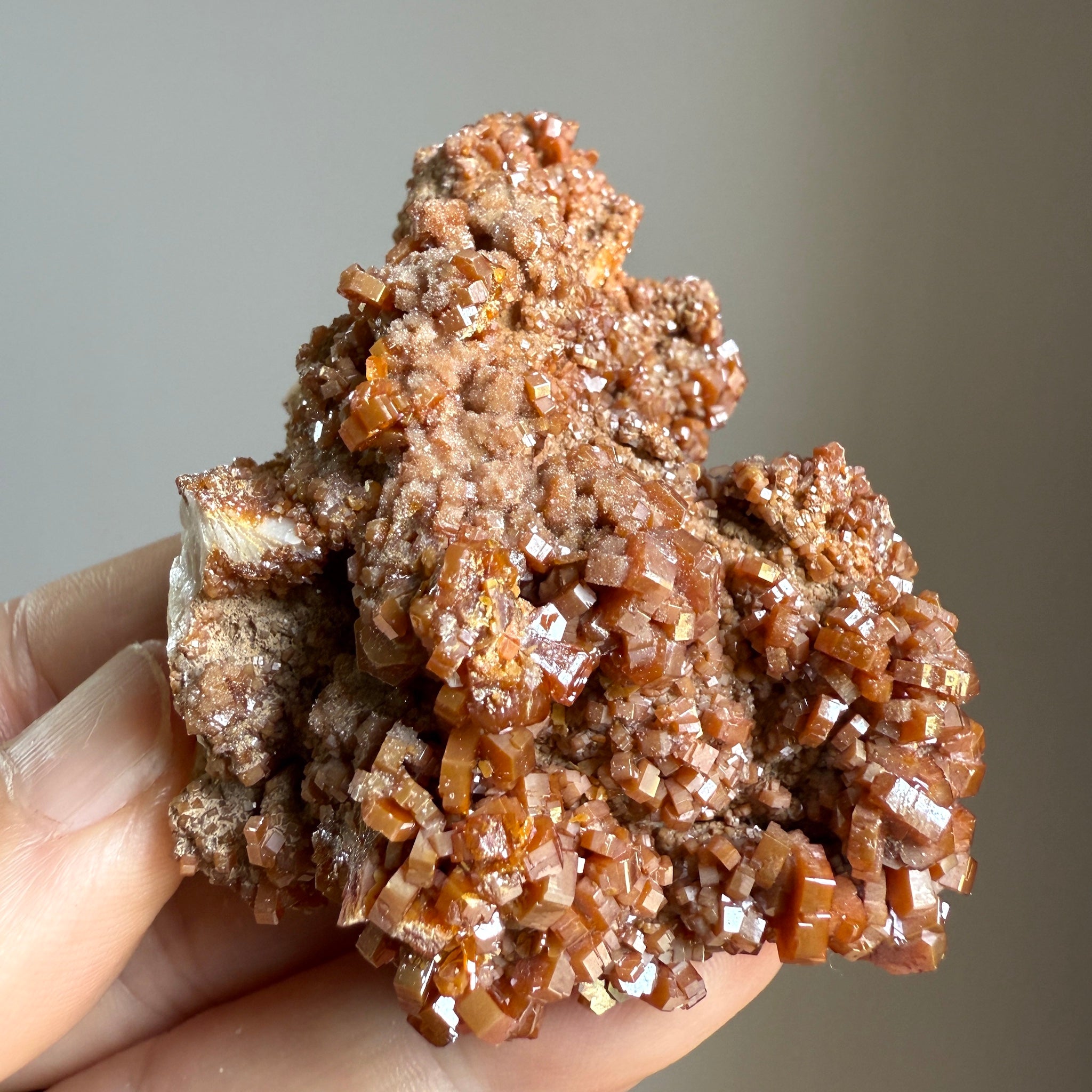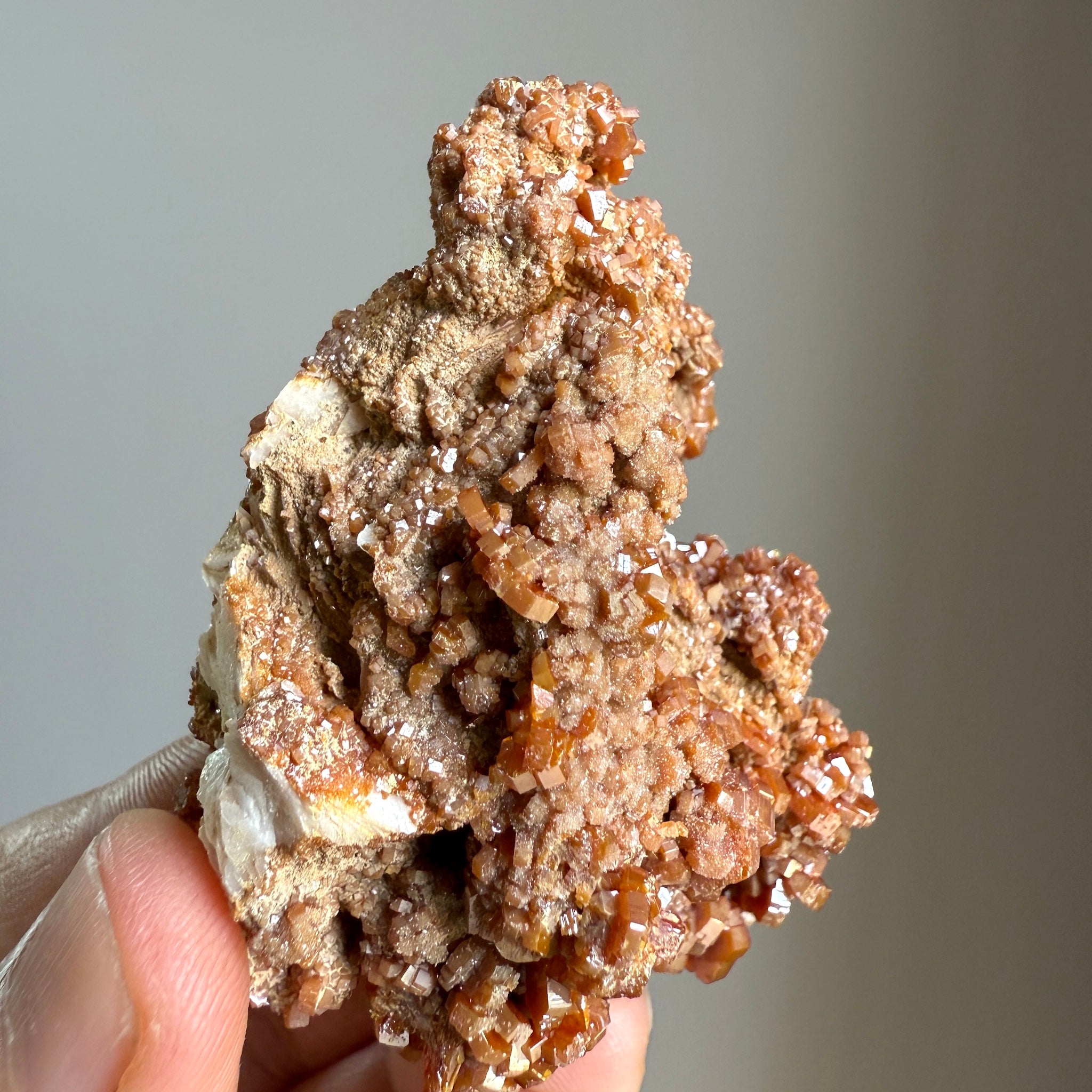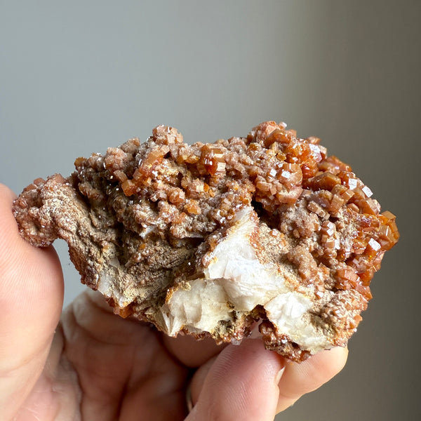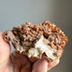 Stunning and sparkling sunset vanadinite, covered in sparkly druzy quartz, vanadinite, calcite with delicate blades of barite underneath the sparkles.