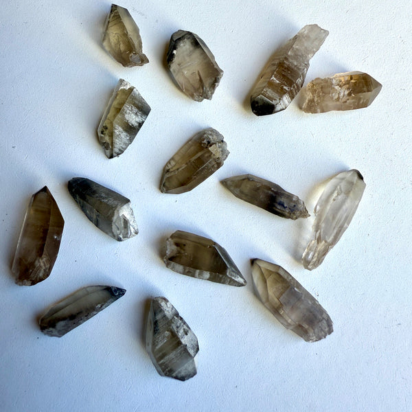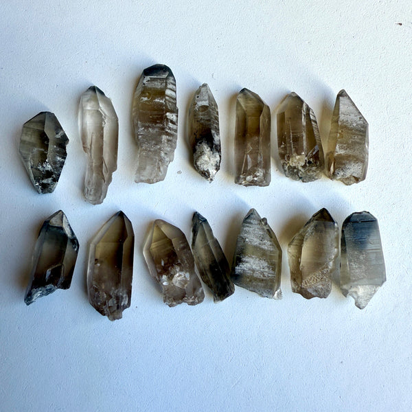 This grid set includes 14 Black Phantom Lemurian Quartz points.
