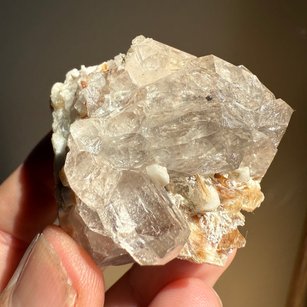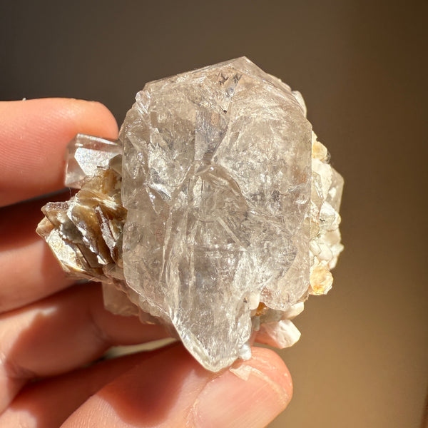 These are a brand NEW ARRIVAL that come from the Himalayan mountains that are a combination of Champagne Topaz, Himalayan Quartz, Mica, and Green Fluorite on a matrix of white Feldspar and Cleavelandite. They may also contain rutile and black tourmaline.