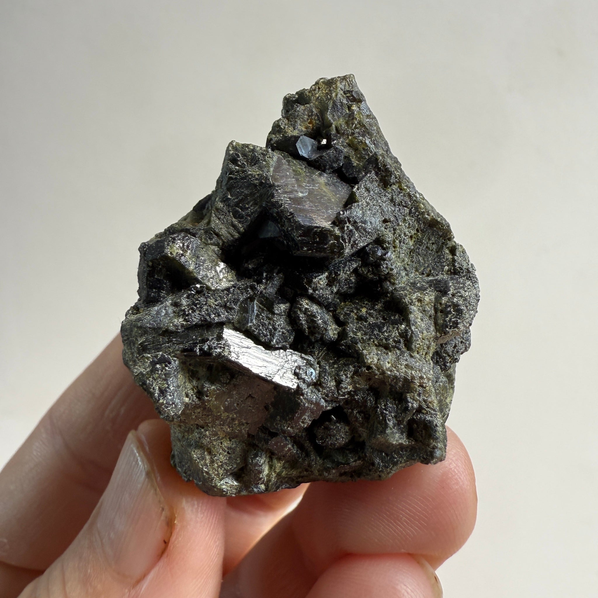 These are green epidote with an unusual and rare pseudo hexagonal shaped form. They also have black “magnetic” magnetite within and green titanite on the outside, adding more layers of complexity to these very complex and strong energy crystals.