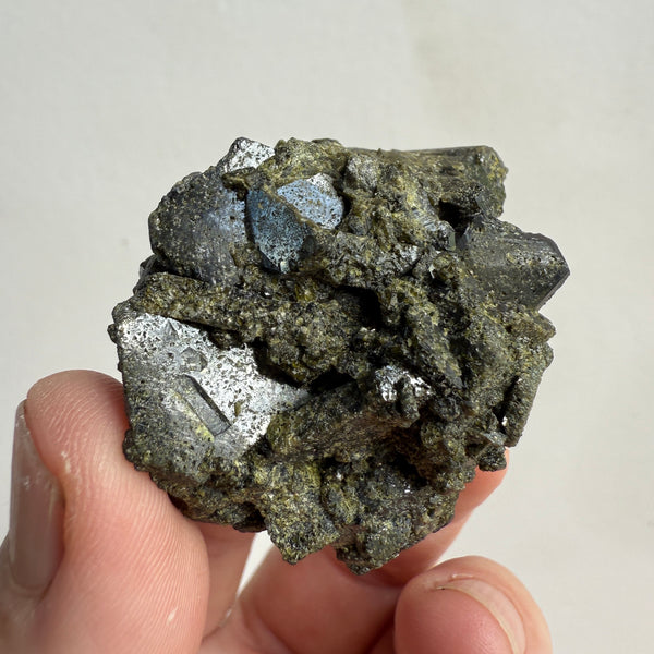 These are green epidote with an unusual and rare pseudo hexagonal shaped form. They also have black “magnetic” magnetite within and green titanite on the outside, adding more layers of complexity to these very complex and strong energy crystals.